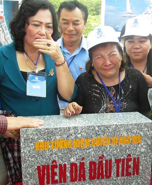 Nhìn thấy dòng chữ “Viên đá đầu tiên” trên tấm bia được ban tổ chức đặt nơi làm lễ khởi công, cựu binh từng tham gia trận hải chiến Gạc Ma 27 năm trước, anh Lê Hữu Thảo đến từ Hà Tĩnh, mắt ngân ngấn nước: “Tôi đợi giây phút này đã lâu lắm rồi. Mấy chục năm qua, tôi luôn nghĩ đến những đồng đội tôi đã nằm lại ở Gạc Ma mà không có một nấm mồ nào. Cha mẹ, vợ con các anh, mỗi ngày lễ, ngày giỗ, muốn đến thắp cho chồng, con họ nén nhang cũng không có chỗ. Và bây giờ, khu tưởng niệm này chính là “nghĩa trang liệt sĩ”, là nơi yên nghỉ của các anh. Tôi thấy ấm lòng về điều đó”. Mẹ Nguyễn Thị Hằng, mẹ liệt sĩ Hoàng Ánh Đông đến từ Quảng Trị nhìn thấy mô hình khu tưởng niệm mà như thể sắp gặp con mình ở một nghĩa trang liệt sĩ nào đó vậy. Mắt bà lúc nào cũng giàn giụa nước.