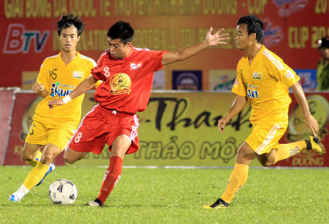 Lee Nguyễn (đỏ) trong màu áo của CLB Bình Dương. Ảnh: An Nhơn.