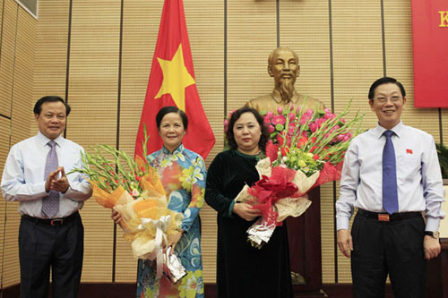 Bà Nguyễn Thị Bích Ngọc (thứ hai từ phải sang) kế nhiệm bà Ngô Thị Doãn Thanh (cạnh) làm Chủ tịch HĐND TP