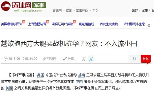 Với tít bài sặc mùi khiêu khích và miệt thị người Việt, Hoàn Cầu viết: "Việt Nam muốn ôm chân phương Tây mua chiến đấu cơ chống Trung Quốc? Cư dân mạng: Tiểu quốc hạ đẳng!" Một tờ báo sống bằng ngân sách của chính phủ Trung Quốc chuyên làm cái việc tuyên truyền kích động chống Việt Nam thì không thể nói đây là "quan điểm riêng" của Thời báo Hoàn Cầu và Trung Nam Hải vô can được - PV.