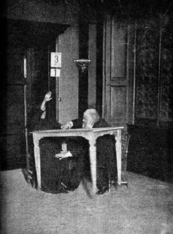Alexandr Aksakov, nhà nghiên cứu tâm lý học người Nga, giữ tay và chân của Palladino trong khi bà tiến hành gọi hồn tại Milan năm 1892. Chiếc bàn đang bay lơ lửng trong không trung. Ảnh: Ancient Origins