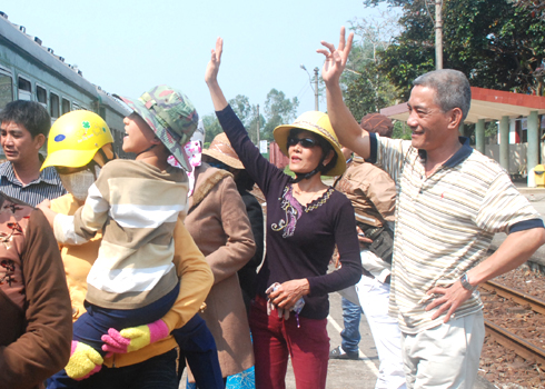 Vẫy tay chào, cầu chúc người thân năm mới gặt hái nhiều thành công ở đất phương Nam. Ảnh chụp tại ga Quảng Ngãi.