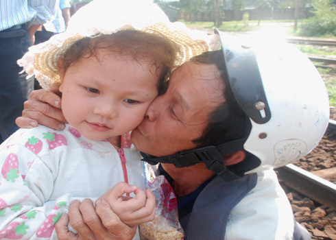 Ông Trần Đức Hoạt quê ở xã Nghĩa Trung, huyện Tư Nghĩa (Quảng Ngãi) quyến luyến ôm hôn cháu gái Trần Như Quỳnh (3 tuổi).