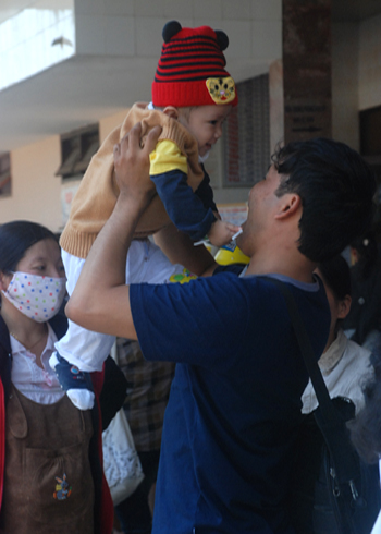 Hai bố con vui đùa trước phút chia tay ở sân ga Quảng Ngãi.