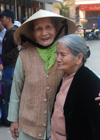 Bà Nguyễn Thị Diệp Thu (90 tuổi, đội nón) chia tay bà thông gia Bùi Thị Thảng (88 tuổi) vào Sài Gòn tại ga Quảng Ngãi.