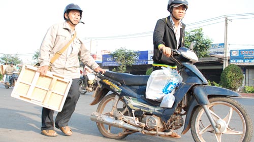 Chiều tối 13-2, chúng tôi tiếp cận một tiệm sửa xe vá ép số 876 quốc lộ 1A, khu phố 4, P.Linh Trung, Q.Thủ Đức, Sài Gòn. Chỉ quan sát trong hơn một giờ nhưng có đến tám người ì ạch dẫn xe với bánh sau cán đinh xếp hàng chờ đợi. Mỗi người đưa xe vào, hai thanh niên nhanh chóng dựng xe, quay bánh một vòng, tay cầm miếng đinh hình thoi sắc nhọn rồi “ồ” lên một tiếng: “Cán đinh rồi, phải thay ruột thôi”. Không đợi khách trả lời, một trong hai thanh niên nạy vỏ thay ruột rồi lấy 70.000-80.000 đồng/chiếc.