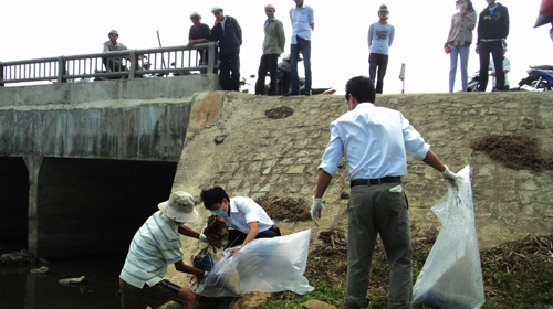 Thu gom xác heo ở kênh Bầu Hạ sáng 22-2 - Ảnh: N.Sơn
