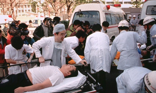 Bác sĩ cấp cứu các nạn nhân bị tấn công bằng khí độc sarin ở Tokyo năm 1995. Ảnh: AP