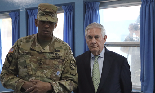 Ngoại trưởng Mỹ Rex Tillerson (phải) bên cạnh tướng quân đội Vincent K. Brooks tại Khu Phi quân sự nằm giữa biên giới Hàn Quốc và Triều Tiên. Ảnh: Reuters