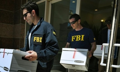 Đặc vụ FBI thu giữ tài liệu từ cơ sở của cha con Chan ở San Gabriel, California. Ảnh: AFP