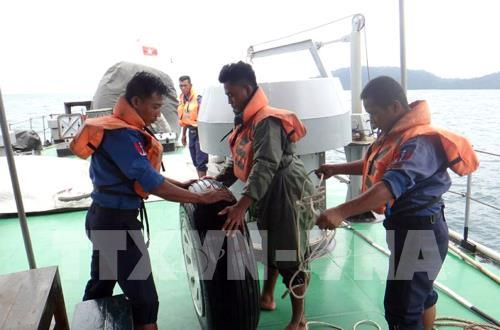 Lực lượng cứu hộ vớt được một chiếc bánh xe của máy bay quân sự bị mất tích ở ngoài khơi tỉnh Launglon ngày 8/6. THX/TTXVN
