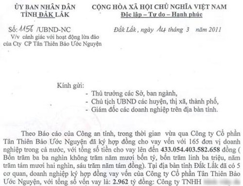 Ủy ban nhân dân tỉnh Đăk Lăk vừa có công văn gửi các cơ quan chức năng trên và giám đốc các doanh nghiệp trên địa bàn về việc cảnh giác với hoạt động lừa đảo của Công ty Cổ phần Tân Thiên Bảo Ước Nguyện (đăng ký kinh doanh tại TP Sài  Gòn).
