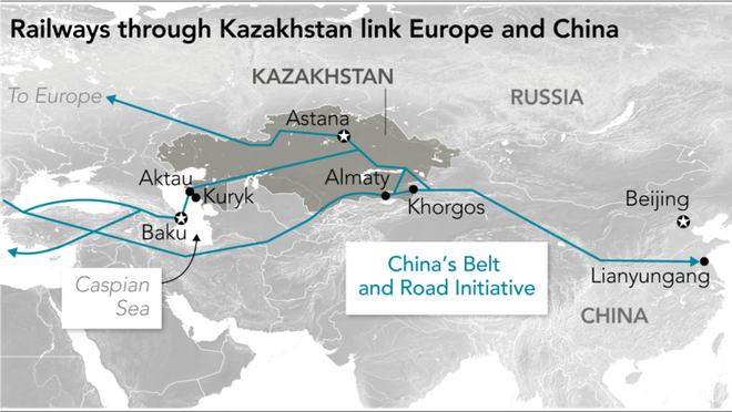 Tuyến đường sắt đi qua Kazakhstan giúp Trung Quốc tiếp cận châu Âu. Ảnh: Nikkei.