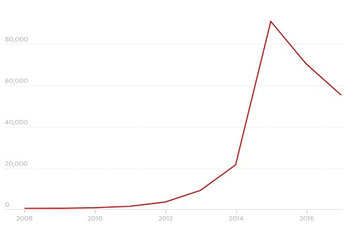 Số lượng khách du lịch Trung Quốc tới Palau qua các năm. Đồ họa: Guardian.