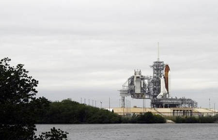 Tàu con thoi Endeavour trên bệ phóng tại Trung tâm Vũ trụ Kennedy vào ngày 29/4. Ảnh: AP.