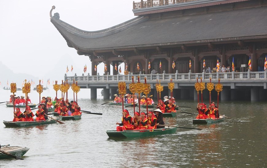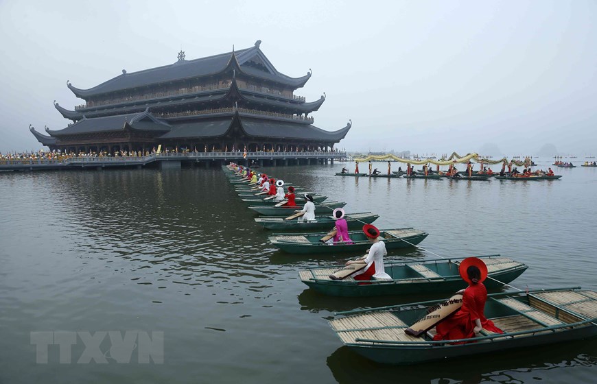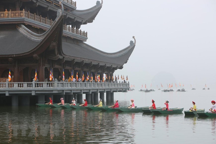 Quang cảnh chèo thuyền trước giờ khai mạc Đại lễ Vesak 2019 tại hội trường chính của Trung tâm Văn hóa Phật giáo Tam Chúc. (Ảnh: TTXVN)
