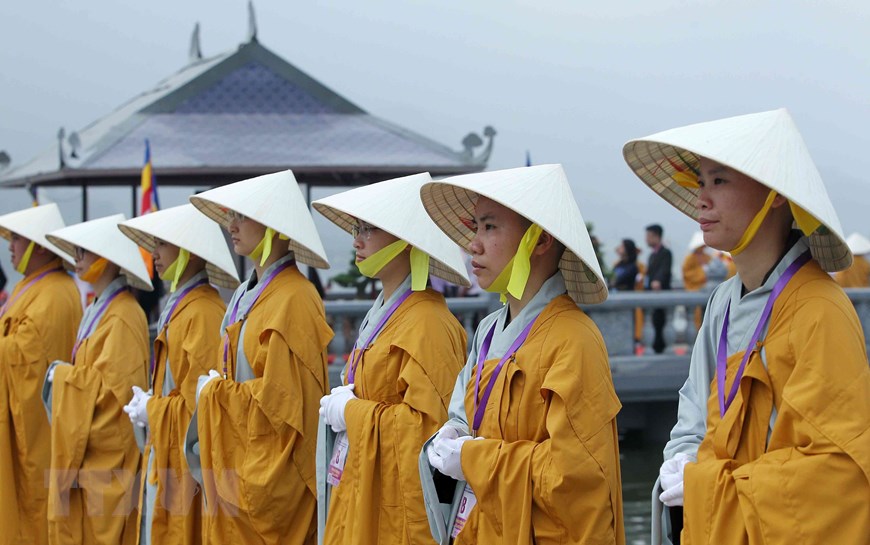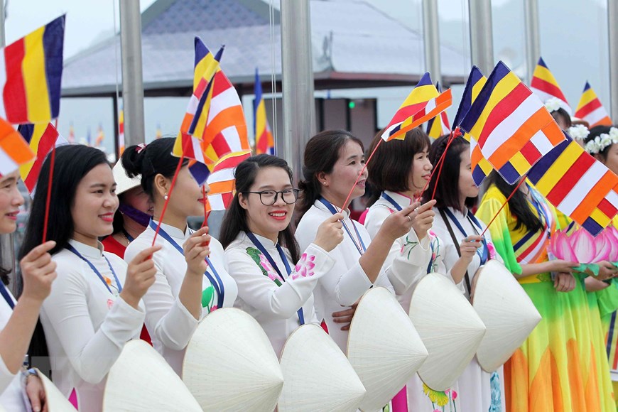 Đoàn Phật tử Cửu Long chuẩn bị đón đại biểu trước giờ khai mạc. (Ảnh: Thành Đạt/TTXVN)