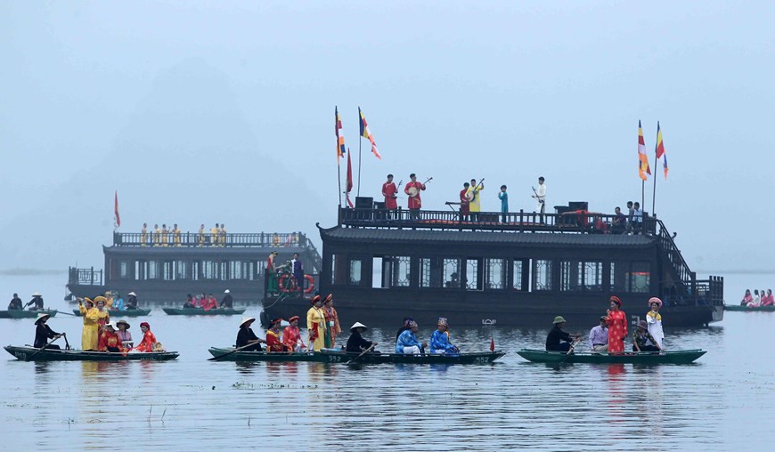 Quang cảnh hát, chèo thuyền rồng trước giờ khai mạc Đại lễ Vesak 2019 tại hội trường chính của Trung tâm Văn hóa Phật giáo Tam Chúc. (Ảnh: TTXVN)