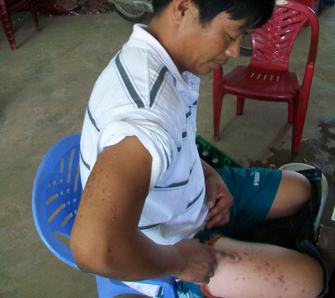 Vết thương trên tay và đùi anh Luận do bị mảnh đạn của bọn cướp gây ra