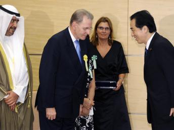 Thủ tướng Nhật Bản Naoto Kan (phải) tiếp chủ tịch Ủy ban Olympic IOC Jacquess Rogge, Tokyo, 15/07/2011.REUTERS