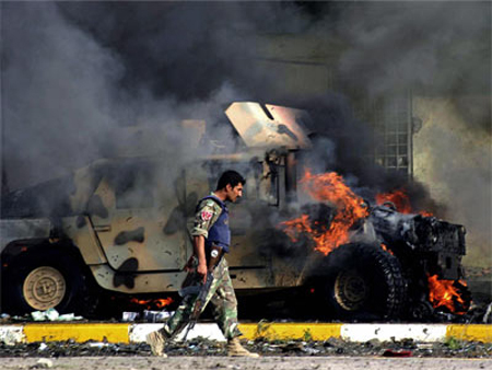 Một xe bọc thép bị phá hủy bởi bom tự chế tại Iraq. Ảnh: wired.com.