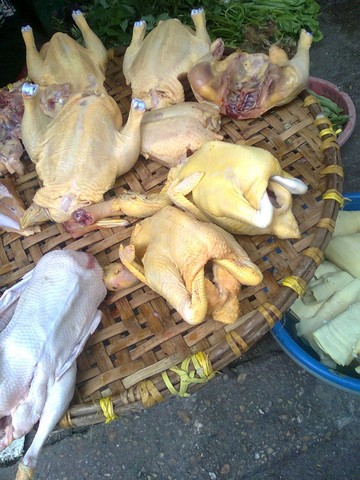 Theo chị, để gà có màu vàng tươi ngon, bắt mắt, sau khi vặt lông, rửa sạch, trước khi đem đi bán, một số tiểu thương đã nhúng gà vào nồi nước sôi trong đó có trộn một loại hoá chất mà nhiều người hay gọi là bột sắt. Loại bột này thấm vào da, rất khó rửa, không phai màu nên gà bán từ sáng đến chiều vẫn bắt mắt.