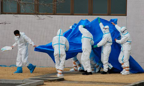 Các công nhân trong nhà máy điện hạt nhân Fukushima I đưa một đồng nghiệp ra ngoài nhà máy sau khi người này phơi nhiễm phóng xạ hồi tháng 4. Ảnh: AP.
