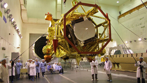 Các nhân viên kỹ thuật chuẩn bị đưa tàu Phobos Grunt vào bệ phóng tại sân bay vũ trụ Baikonur ở Kazakhstan. Ảnh: RIA Novosti.