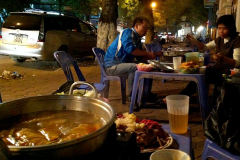 Tại khu vực Hồ Tây, Hàn Thuyên, Kim Mã, Xã Đàn... hàng loạt quán lẩu được bày bán ngay vỉa hè. Từng ăn ở quán lẩu trên đường Kim Mã, anh Nguyễn Mạnh Tiền vẫn ngán bởi luôn phải "hưởng kèm" khói xe, bụi. Anh Tiền kể lại, quán nằm gần bến xe bus nên rất nhiều khách mở nồi gặp đúng lúc xe xả khói đen sì ngang qua, những hôm mưa còn bắn cả bùn bẩn vào nồi. "Đổ đi thì phí mà ăn thì mất vệ sinh nên lắm phen cả nhóm dở khóc dở cười", anh Tiền chia sẻ.