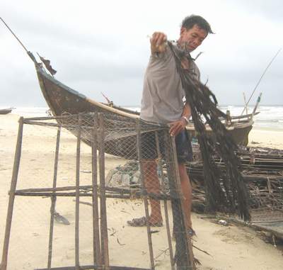 Ngư dân Bùi Văn Bồng sửa lại ngư cụ chờ biển yên lại ra khơi.