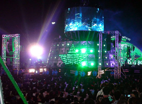 Hàng trăm du khách hòa cùng người dân TP Sài Gòn đón năm 2012 bằng màn trình diễn ánh sáng nghệ thuật. Ảnh: N.S