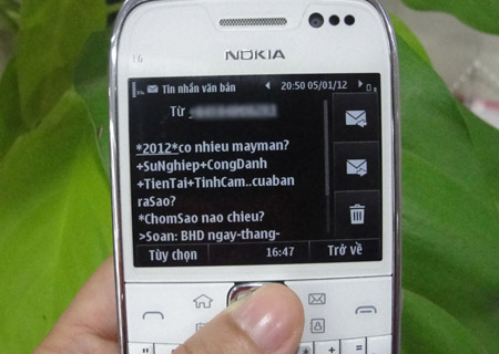 "2012 có nhiều may mắn? Sự nghiệp, công danh, tiền tài, tình cảm... của bạn ra sao? Xuất hành hướng nào? Soạn BHD ngày-tháng-năm sinh gửi 87XX", tin nhắn dụ bói toán đổ bộ dịp này khiến nhiều thuê bao bức xúc.