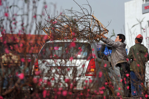 Một cành đào rừng khách chọn mua được chất lên nóc ôtô.