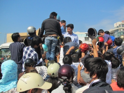 Dưới cái nắng gay gắt, một cảnh hỗn loạn chưa từng thấy xảy ra tại Đà Nẵng khi xe chở mũ xuất hiện. Hàng ngàn người, hàng ngàn cánh tay cầm tiền và mũ cũ chen lấn, xô đẩy, đạp lên nhau để vào đổi tại gian hàng. Nhiều người còn liều lĩnh trèo lên ô tô chở mũ để tranh nhau đổi, bất kể già trẻ, gái trai.