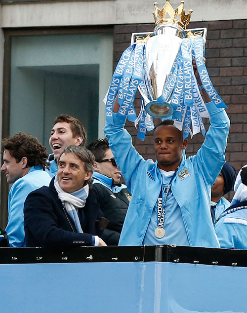 Kompany nâng cao chiếc cúp vô địch Giải ngoại hạng Anh mùa bóng 2011-2012. Bên trái là HLV Roberto Mancini - Ảnh: Reuters