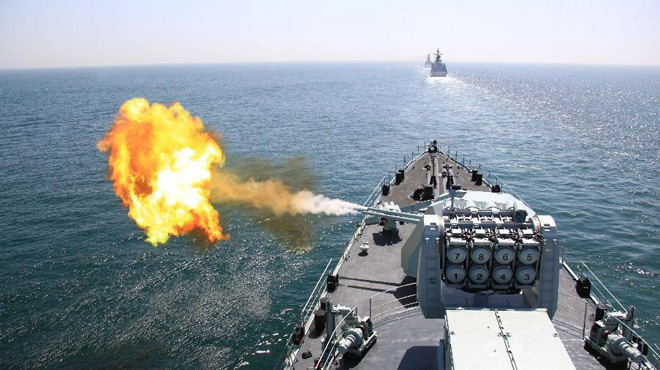 Tàu khu trục mang tên lửa DDG-112 Harbin của Trung Quốc trong một lần tập trận trên biển - Ảnh: Tân Hoa xã