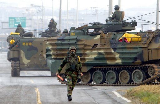 Xe lội nước của hải quân Hàn Quốc tại một ngôi làng ở đảo Baegnyeong - Ảnh: AFP