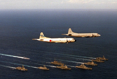 Phi cơ trinh sát biển P-3 của Mỹ và chiếc P-3 của Nhật bay trên trời trong khi đoàn tàu chạy trên biển trong cuộc tập trận RIMPAC năm 1998. (Hình: Bộ Quốc Phòng Hoa Kỳ)