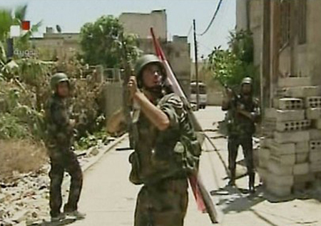 Đài truyền hình Syria phát sóng cảnh tượng binh lính chính phủ giao tranh với phe đối lập tại quận Basatin al-Razi ở thành phố Damacus hôm 22/7. Ảnh: AFP.