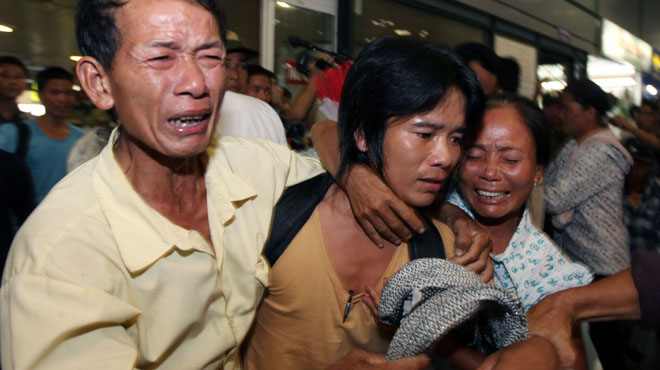 Bà Hoàng Thị Thu (ở Nghi Tiến, Nghi Lộc, Nghệ An) cùng hai con nhỏ lao vào ghì chặt thuyền viên Trần Văn Toàn, nức nở: “Con về đến đây là tốt quá rồi, phúc đức cao dày lắm con ơi...”. Còn bà Nguyễn Thị Quế (Nghi Vạn, Nghi Lộc, Nghệ An - mẹ thuyền viên Bùi Văn Hóa) nói với phóng viên trong tiếng nấc: “Tui sướng lắm các chú ơi. Bị bắt gần hai năm trời thì mãi gần một năm, hắn mới gọi điện về một lần mà chẳng nói chi, chỉ khóc và bảo “nếu có gì xảy ra, con xin lỗi bố mẹ”. Tối qua nghe thời sự nói được thả về hôm nay, 10g đêm tui ra ga bắt tàu đi ngay Hà Nội, ngủ đêm trên ga sân bay đón hắn. Giờ hắn về ngay trước mắt, tôi không biết mình có ngủ mơ không nữa”.