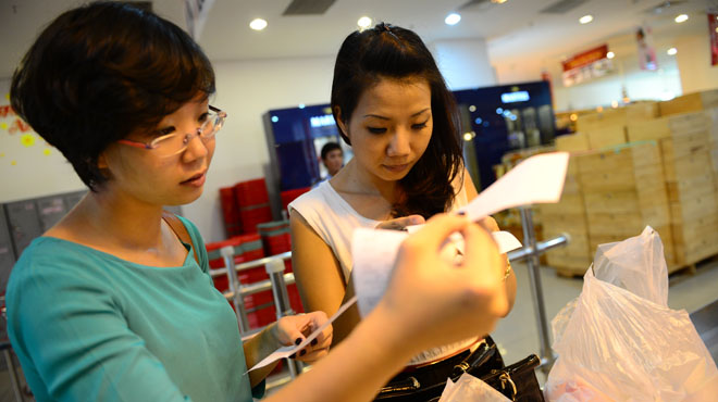 Hai chị Vũ Tố Quyên và Hoàng Ngọc Mai Phương (làm ở Công ty cổ phần Nụ cười khách hàng, Q.1, TP.Sài Gòn) cho biết nếu mức đánh thuế thu nhập cá nhân 9 triệu đồng/tháng thì cuộc sống của họ và gia đình sẽ được thoải mái hơn một chút - Ảnh: THUẬN THẮNG