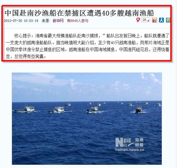 Trong một tin nhắn phóng viên Tân Hoa Xã tải lên blog cho biết, 30 tàu cá Trung Quốc khi đang chạy trên biển Đông đã chạm trán khoảng 40 tàu cá Việt Nam mà phóng viên Tân Hoa Xã rêu rao rằng đó là vùng biển đang nằm trong khu vực Bắc Kinh ra lệnh cấm đánh bắt cá (phi lý và phi pháp).