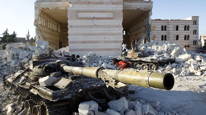 Xe tăng của quân đội Syria bị phá hủy sau một cuộc đụng độ ở Azaz, gần Aleppo - Ảnh: Reuters