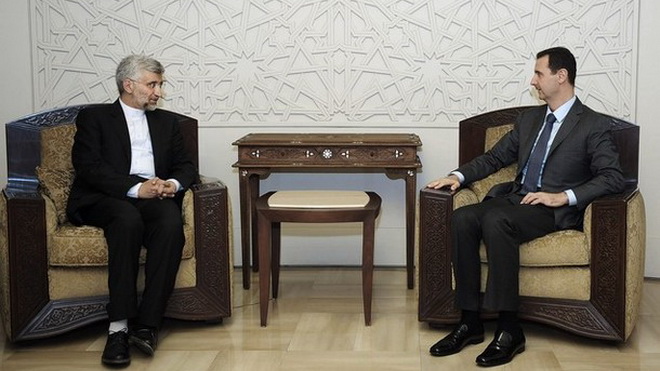 Ông Assad (phải) gặp ông Jalili ở Damascus ngày 7-8 - Ảnh: AP