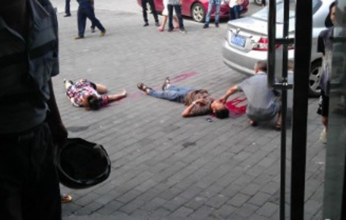 Tại hiện trường, 2 người nằm sõng soài dưới mặt đất trong vũng máu, một nam một nữ.