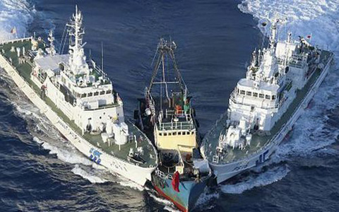 Tàu tuần duyên Nhật áp sát tàu của nhà hoạt động Trung Quốc. Ảnh: Huanqiu