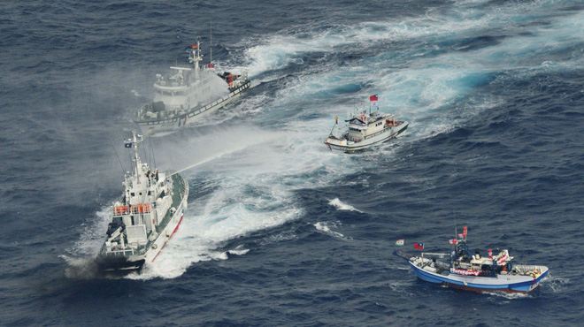 Tàu tuần duyên Nhật (góc trái) xịt vòi rồng vào tàu Đài Loan gần Senkaku/Điếu Ngư hôm 25-9 - Ảnh: Reuters