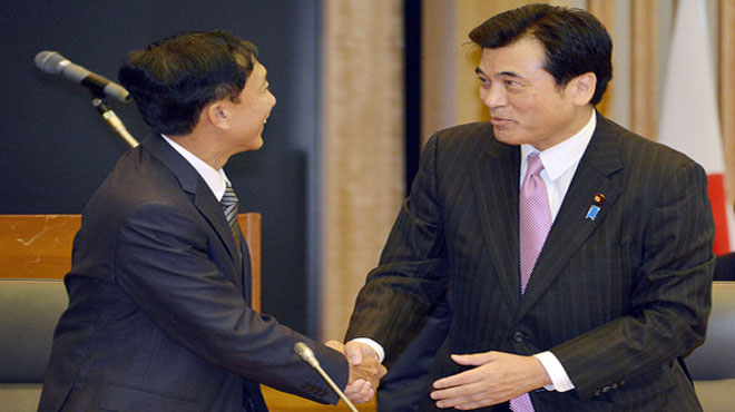 Bộ trưởng tài chính Nhật Bản Koriki Jojima (phải) bắt tay người đồng cấp Myanmar Win Sein hôm 11-10 - Ảnh: Wall Street Journal