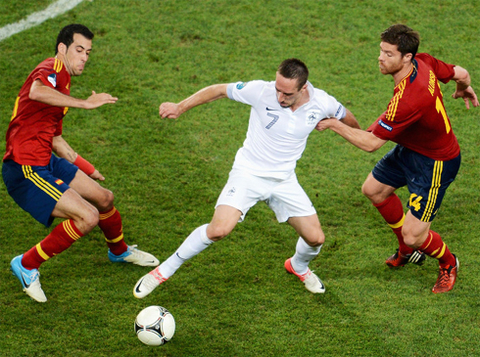 Tây Ban Nha bắt đầu hiệp hai với ca chấn thương thứ hai. Kết quả là hậu vệ Alvaro Arbeloa phải nhường chỗ cho Juanfran. Tranh thủ cơ hội, tiền vệ cánh Ribery của Pháp mạnh dạn tấn công hơn hẳn so với hiệp một. Cú sút đổi hướng của ngôi sao đang thi đấu cho Bayern Munich ở phút 58 và pha tiếp bóng suýt thành công của Koscielny sau đó đã báo hiệu một hiệp đấu đầy sóng gió cho Tây Ban Nha. Giữa hiệp hai, Fabregas và Xavi đều có cơ hội nhân đôi cách biệt, nhưng hàng thủ đội khách kịp can thiệp trước khi bóng đi vào lưới.