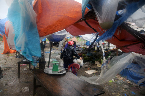 Các lán ở một khu chợ xã Kim Đồng (huyện Kim Sơn, Ninh Bình) bị gió giật tả tơi. Ảnh: Hải Hà.